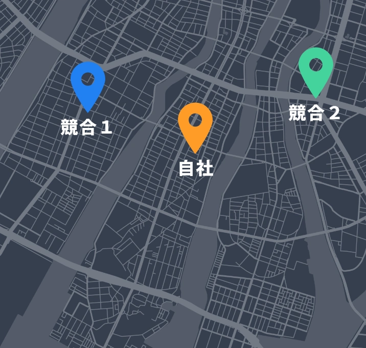 『エリア(事業所立地)』『ユーザーの年代・性別』『ユーザーの居住エリア』の3つの指標で自社と競合を比較検証。